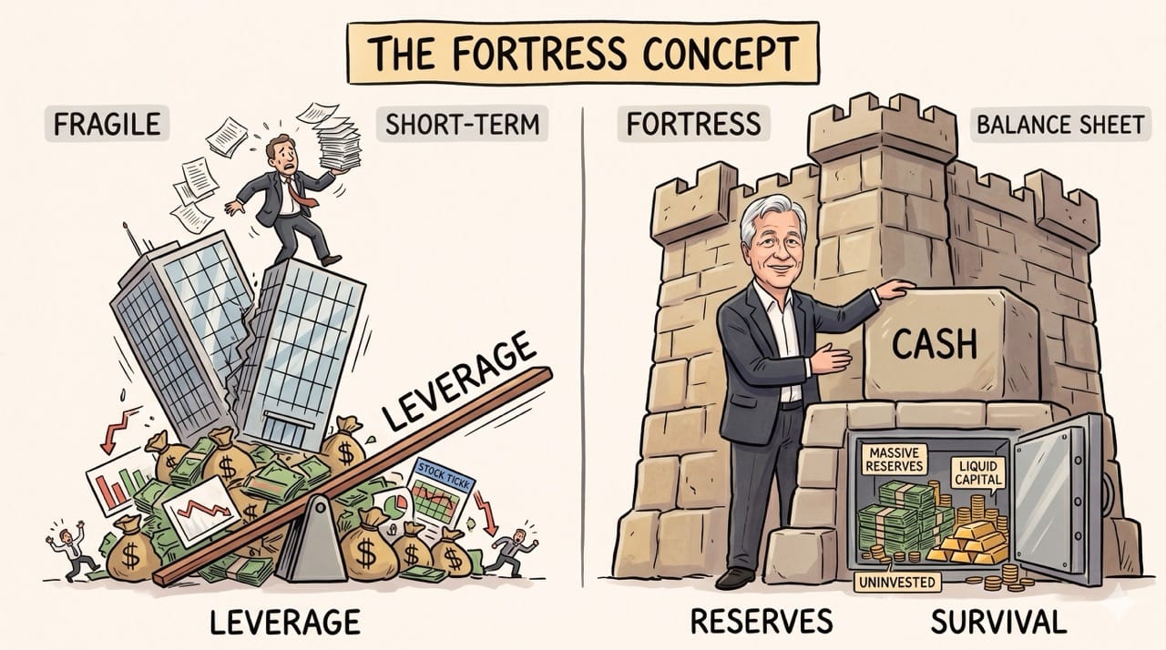 Dimon vehemently rejects this fragile strategy by mandating what he proudly calls a fortress balance sheet.