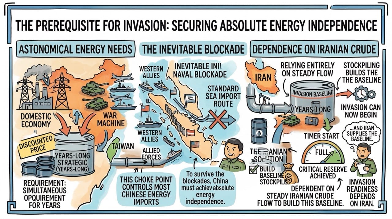 Beijing needs absolute energy independence before launching an invasion. The chaos in the Strait of Hormuz just pushed that timeline back by years.