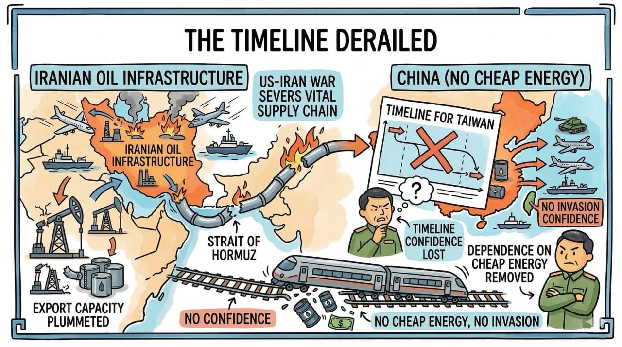 Iranian oil infrastructure is under direct threat, and export capacities have plummeted. Without this continuous flow of cheap energy, the Chinese military cannot confidently lock in a timeline for Taiwan.