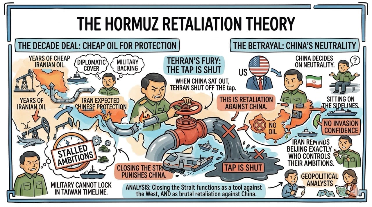 Inspiration: Analyzing the secondary geopolitical effects of the US and Iran conflict. Realizing that the closure of the Strait of Hormuz directly starves the Chinese military machine of the cheap oil required for a Pacific war.