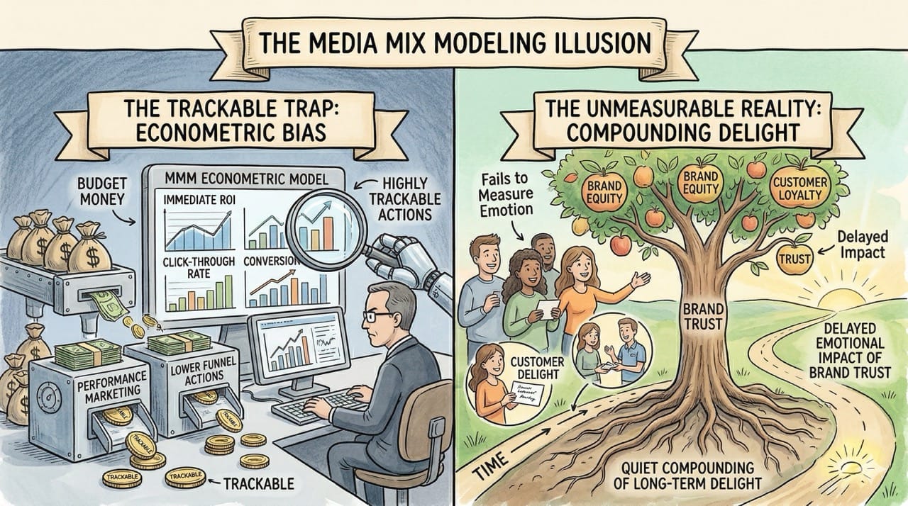 MMM still biases corporate budgets toward highly trackable, lower funnel actions while completely ignoring the quiet compounding of long term customer delight.