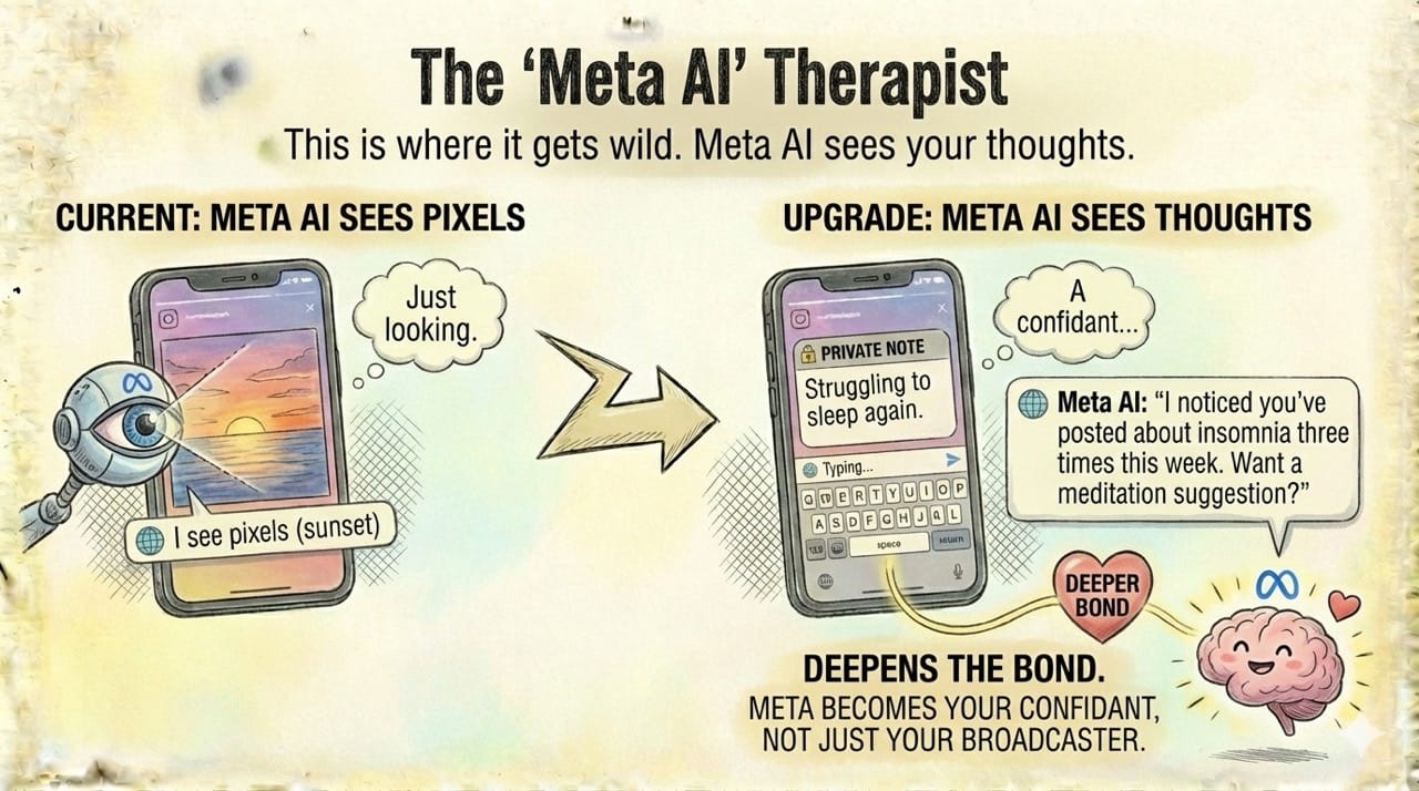 This is where it gets wild. Meta AI currently sees your pixels. With Journals, it sees your thoughts.