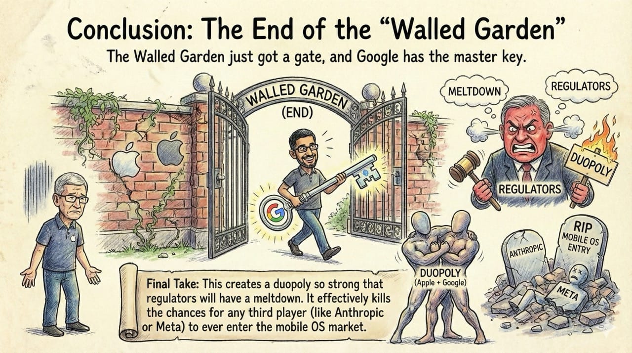 Final Take: This creates a duopoly so strong that regulators will have a meltdown. It effectively kills the chances for any third player (like Anthropic or Meta) to ever enter the mobile OS market.
