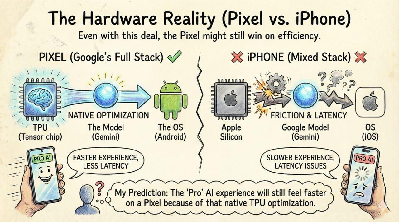 Google controls the full stack: The TPU (Tensor chip) + The Model (Gemini) + The OS (Android). Apple is running a Google model on Apple Silicon.