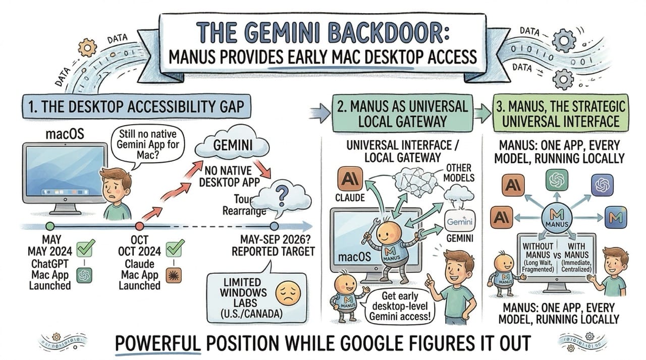 Manus will integrate Gemini before Google ships a native macOS app. The incentive is obvious. Millions of Mac users want Gemini access. Manus can offer it first.
