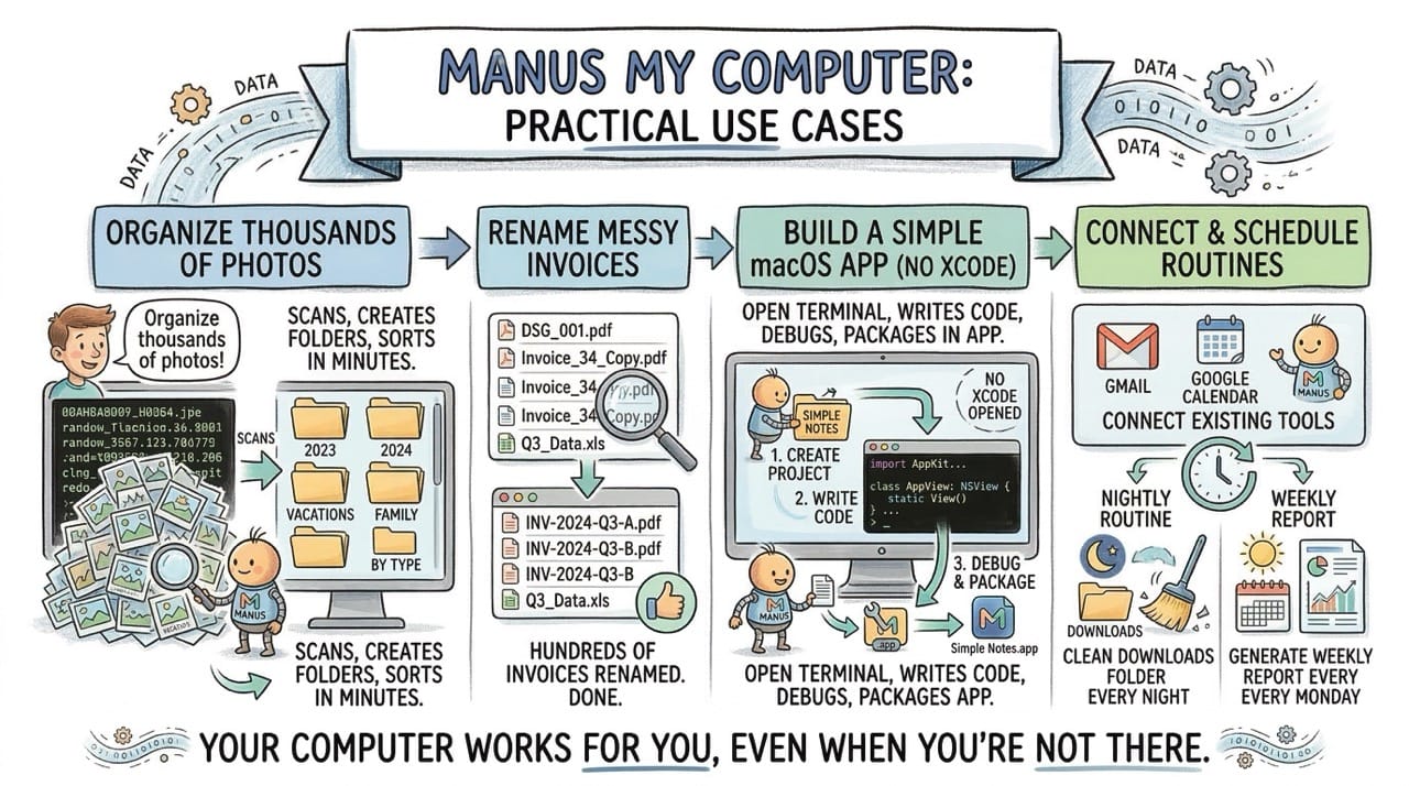 You have thousands of unsorted photos. You tell Manus to organize them. It scans each image, creates folders by type or date, and sorts everything in minutes.