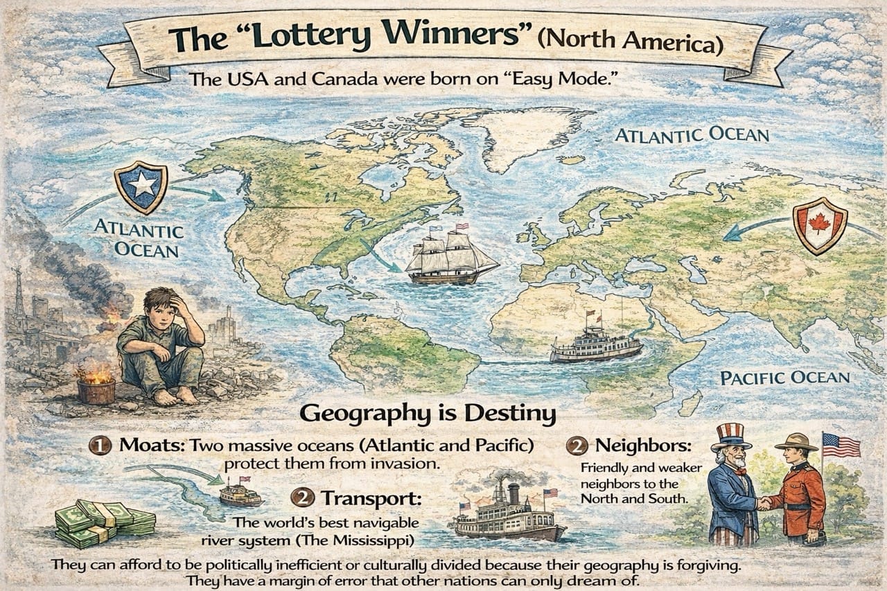 We love the myth of the "Self-Made Man." But the truth is, most success is environmental. Nations are dealt a hand of cards—navigable rivers, oil, neighbors—that they cannot change.