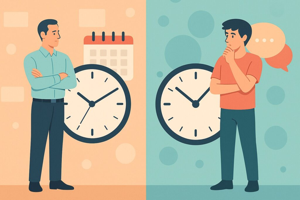 - Polychronic (P-Time): Time is fluid, cyclical, and human. Relationships are more important than schedules.