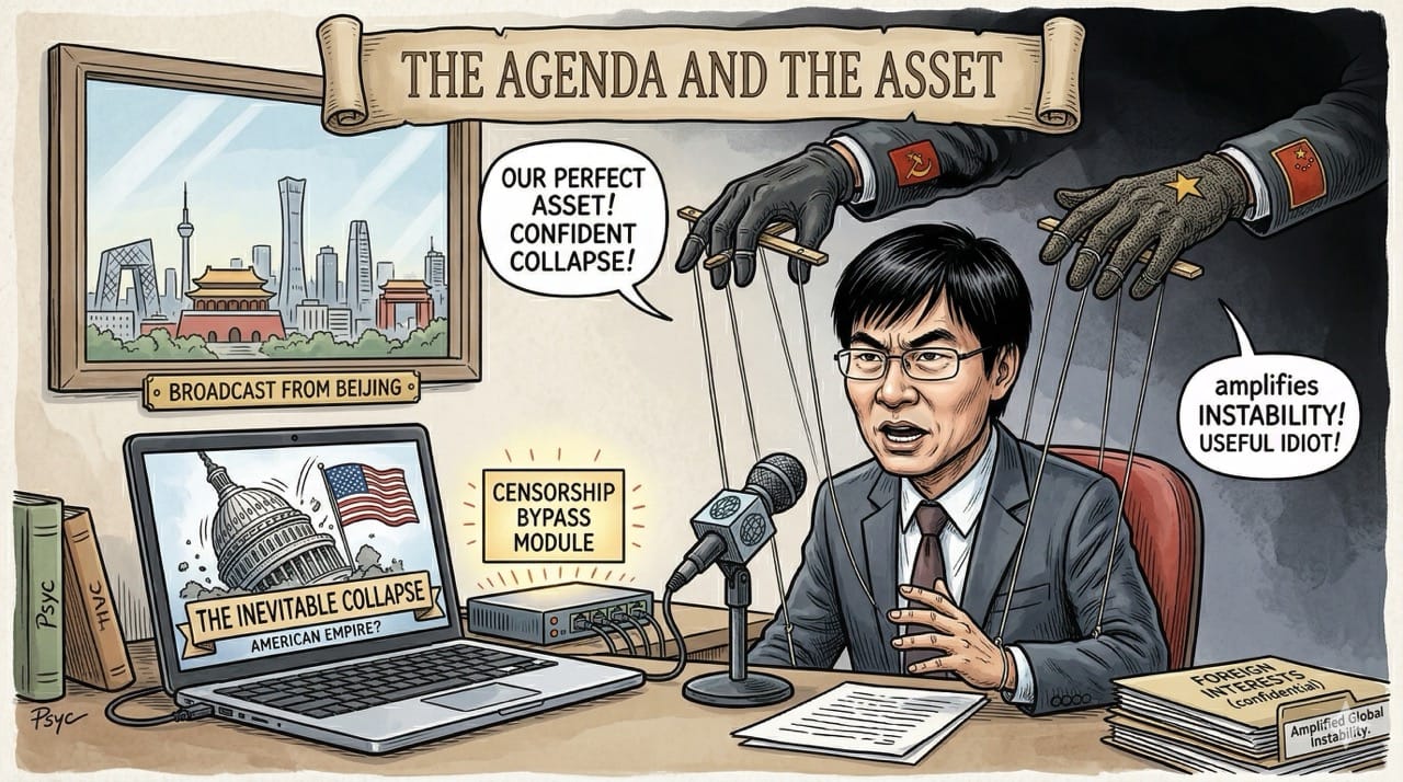 During interviews, he openly admits he might be functioning as a useful idiot for foreign governments who want to amplify global instability.