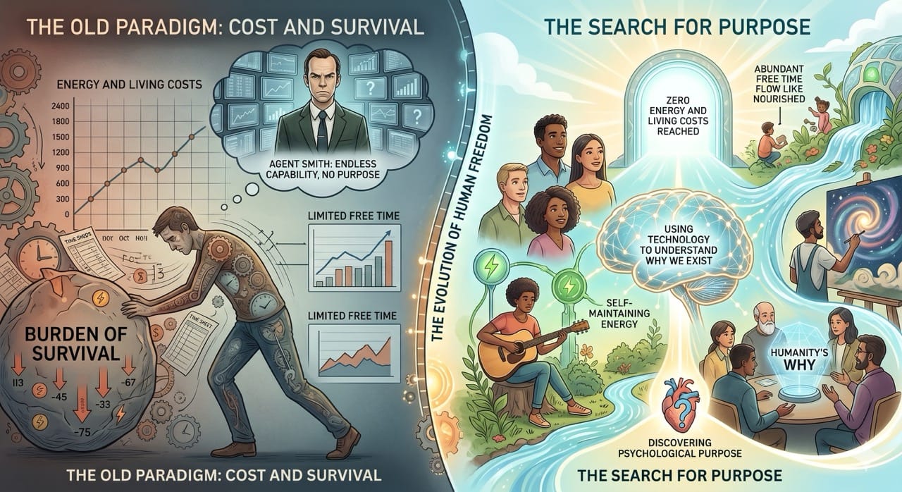 As absolute energy and living costs approach zero, humans will finally possess the necessary free time to discover their true psychological purpose.