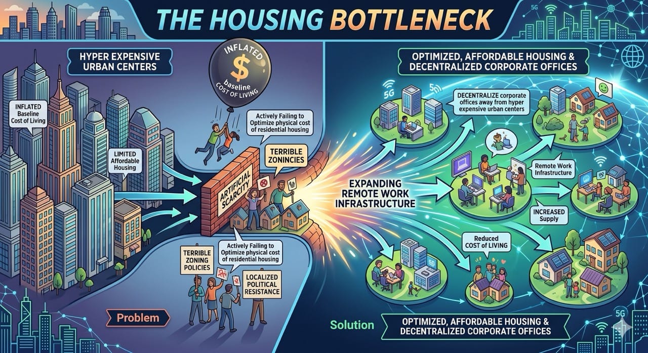 The ultimate solution requires expanding remote work infrastructure to completely decentralize corporate offices away from hyper expensive urban centers.