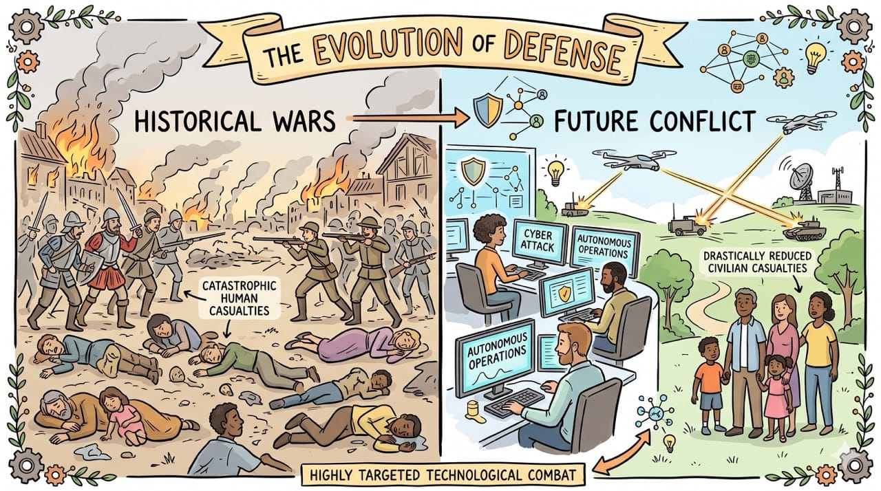 This highly targeted technological combat will drastically reduce civilian casualties and ensure the physical impacts of war are incredibly short lived.
