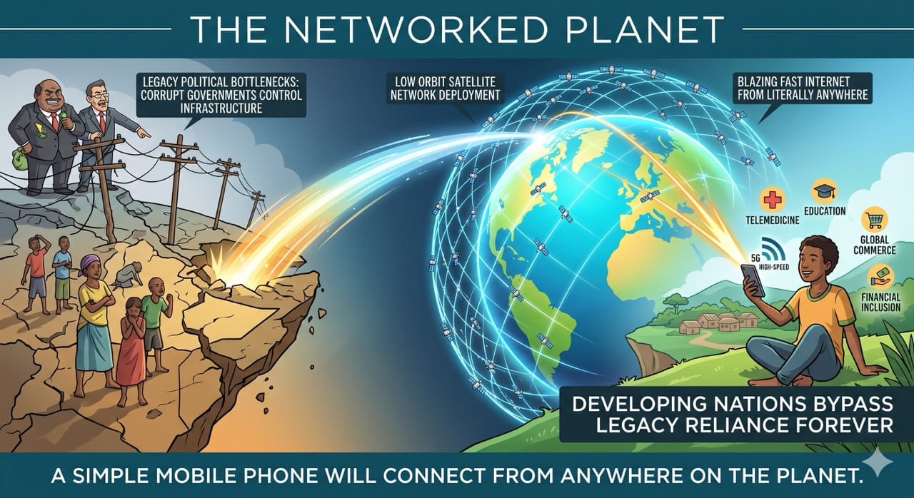 The rapid deployment of low orbit satellite networks completely bypasses these legacy political bottlenecks forever.