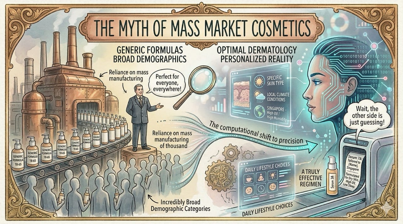 The traditional cosmetic industry relies on mass manufacturing generic formulas for incredibly broad demographic categories.