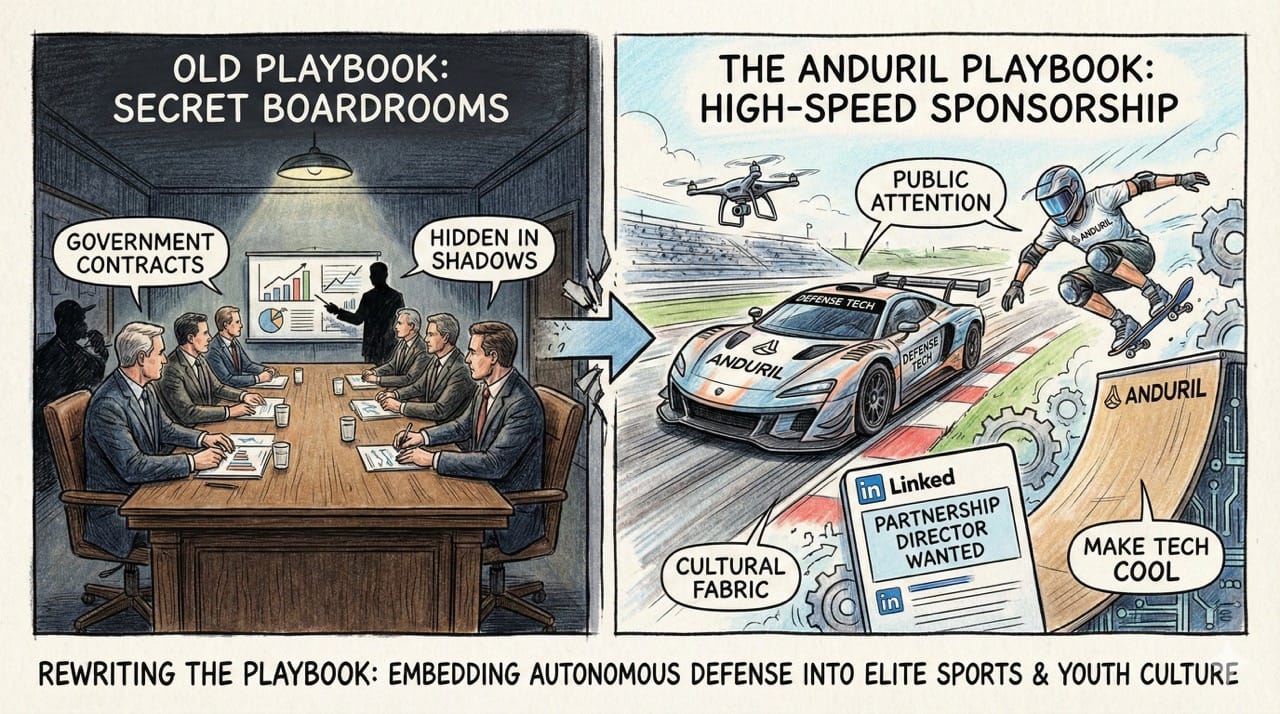 Companies like Anduril are actively capturing public attention by sponsoring high-speed racing and extreme sports events.