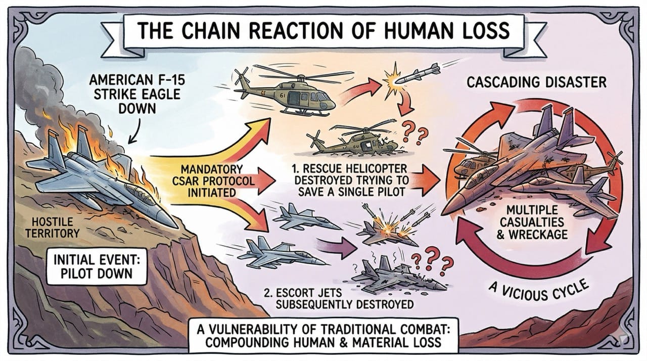 Inspiration: Analyzing the simulated loss of a US F15 Strike Eagle and the subsequent disastrous rescue mission in Iranian airspace. Realizing that the military budget is shifting away from manned platforms entirely to avoid these compounding biological liabilities.
