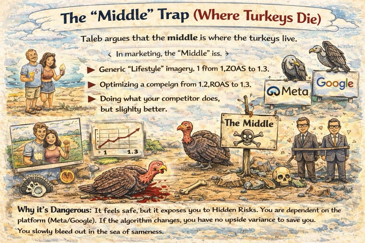 Nassim Taleb calls the middle the "Valley of the Turkey." In marketing, this is where mediocrity lives. Here is how to use the Barbell Strategy to protect your downside and capture infinite upside.