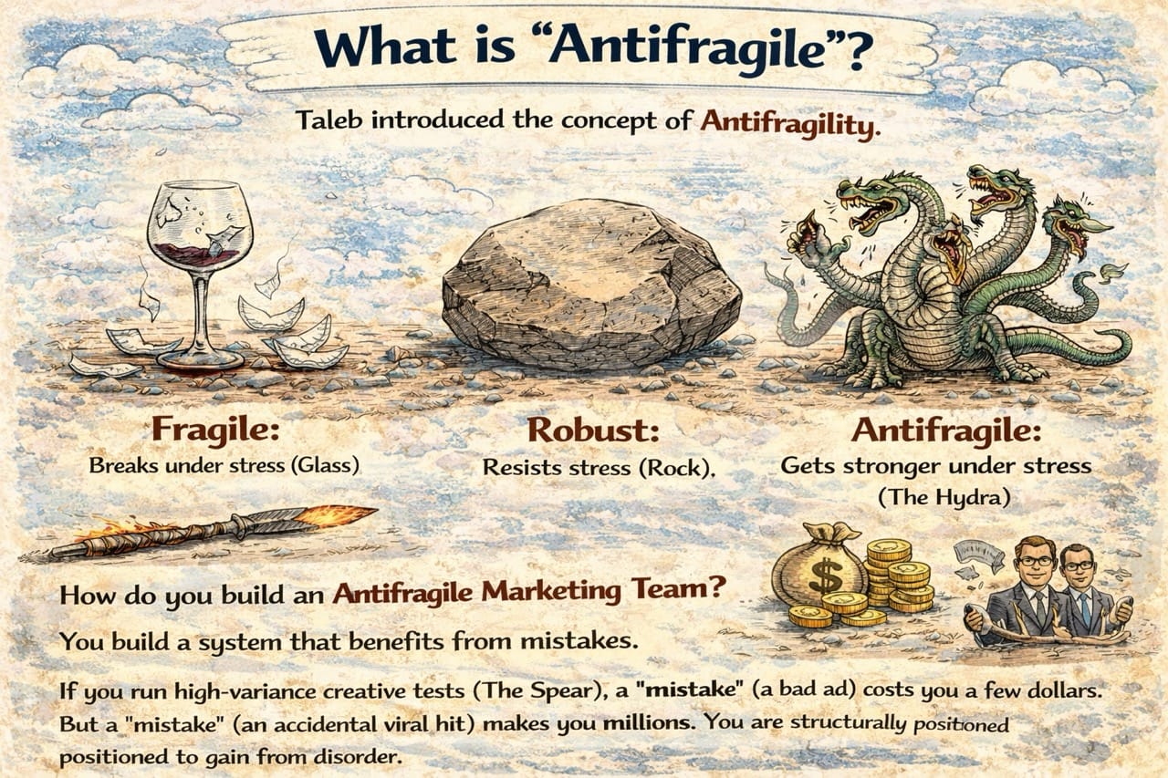 If you run high-variance creative tests (The Spear), a "mistake" (a bad ad) costs you a few dollars. But a "mistake" (an accidental viral hit) makes you millions. You are structurally positioned to gain from disorder.