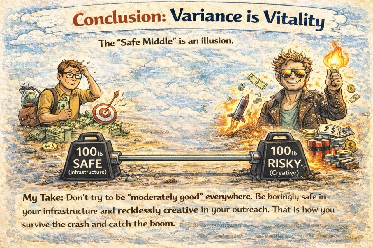 My Take: Don't try to be "moderately good" everywhere. Be boringly safe in your infrastructure and recklessly creative in your outreach. That is how you survive the crash and catch the boom.