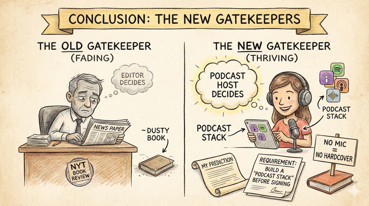 They will demand that authors build a "Podcast Stack" before they even sign the book deal. If you can't hold a mic for 3 hours, you can't sell a hardcover.