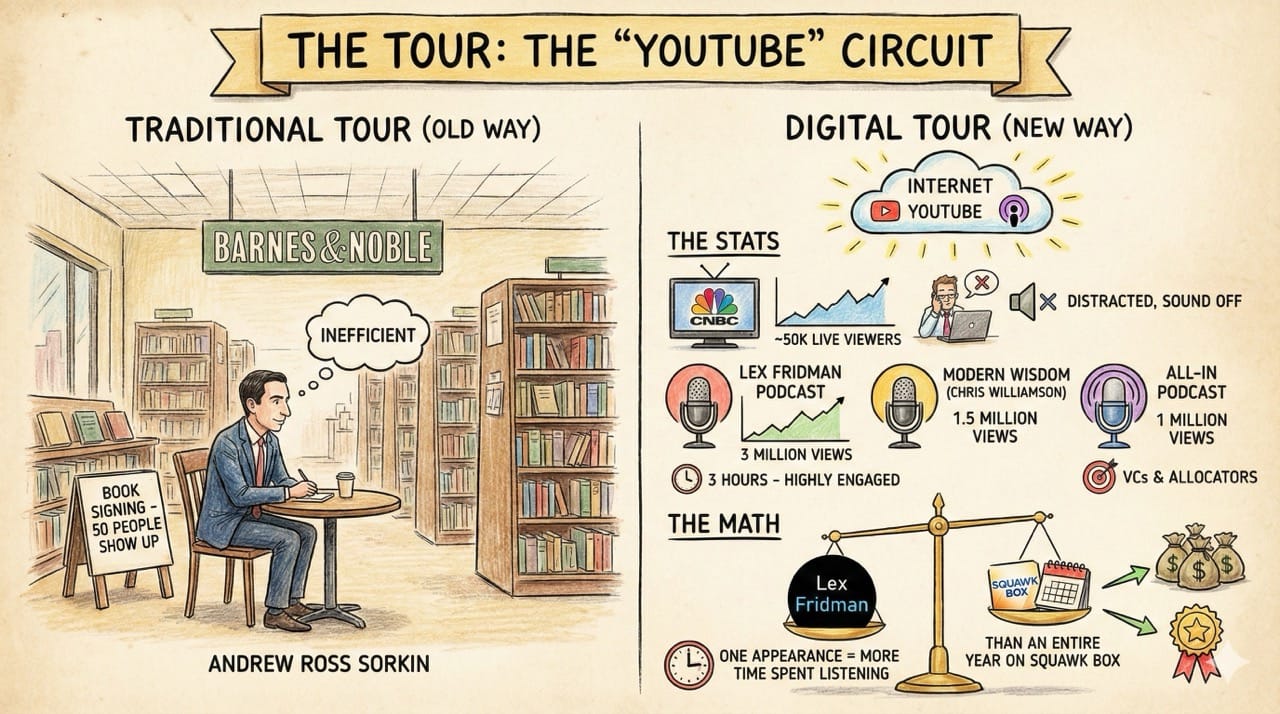 Inspiration: Seeing Andrew Ross Sorkin—the ultimate TV anchor—sitting in Joe Rogan’s and Lex Fridman’s studios, looking uncomfortable but knowing it was the only way to reach the audience.