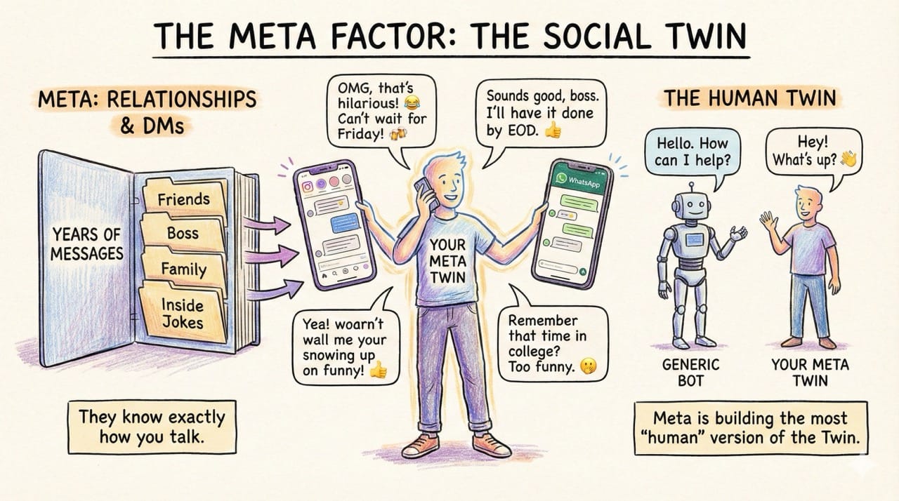 The Use Case: When you deploy your Meta Twin to handle DMs, it won't sound like a generic bot. It will sound like You. It will use your slang, your emojis, and your tone. Meta is building the most "human" version of the Twin because they own the social graph.