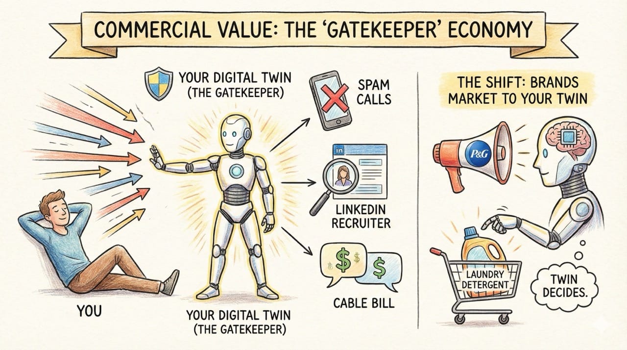 The Shift: Brands will stop marketing to you. They will market to your Twin. If your Twin decides which laundry detergent to suggest to you, P&G needs to convince the algorithm, not the human.