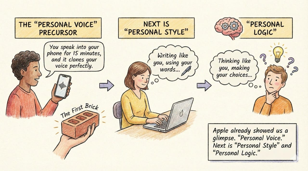 You speak into your phone for 15 minutes, and it clones your voice perfectly. This was the first brick. Next is "Personal Style" (writing like you) and "Personal Logic" (thinking like you).