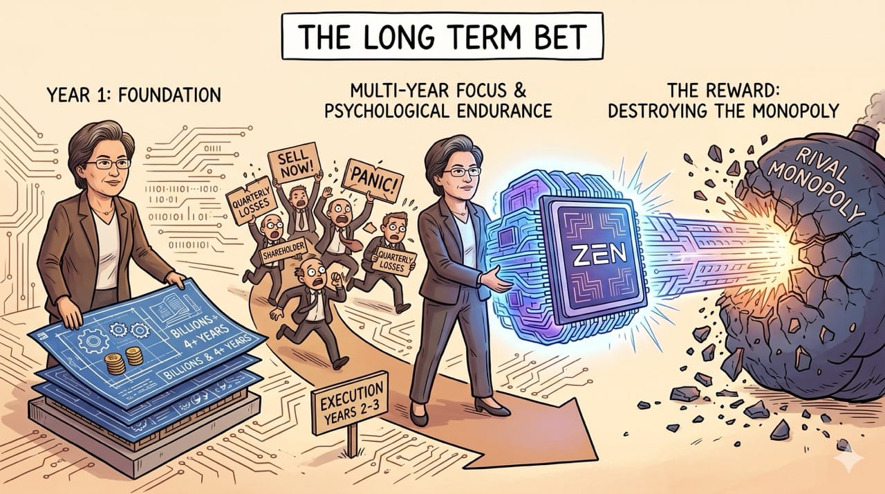 This incredible focus eventually birthed the Zen microarchitecture which fundamentally destroyed the monopoly previously held by their massive corporate rival.