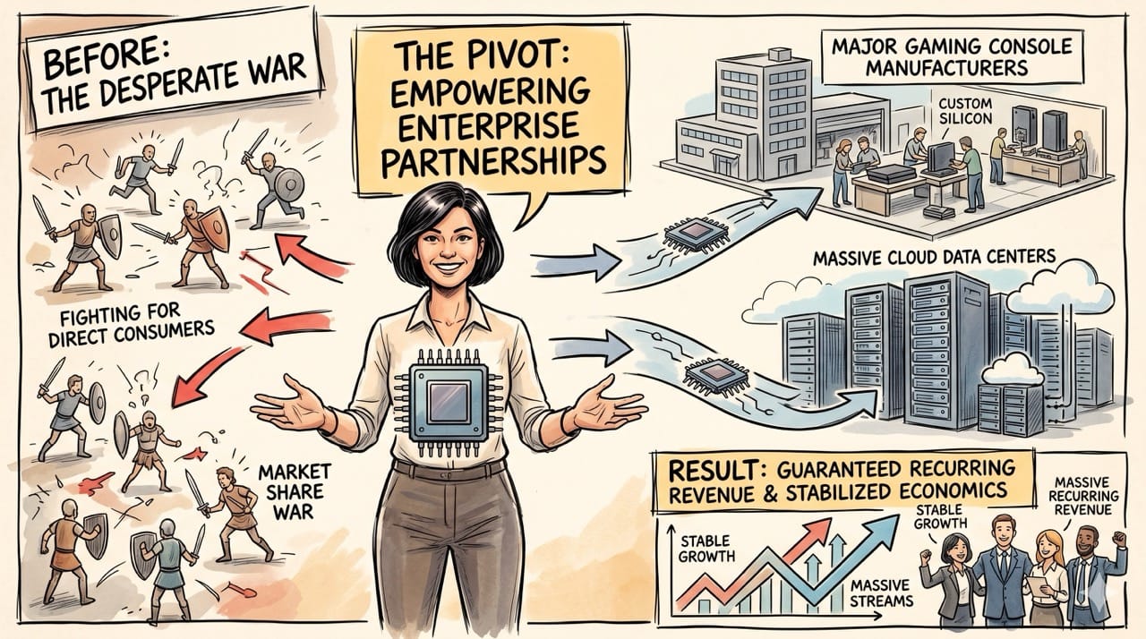Instead of fighting a desperate war for direct consumer market share she pivoted aggressively toward massive enterprise partnerships.