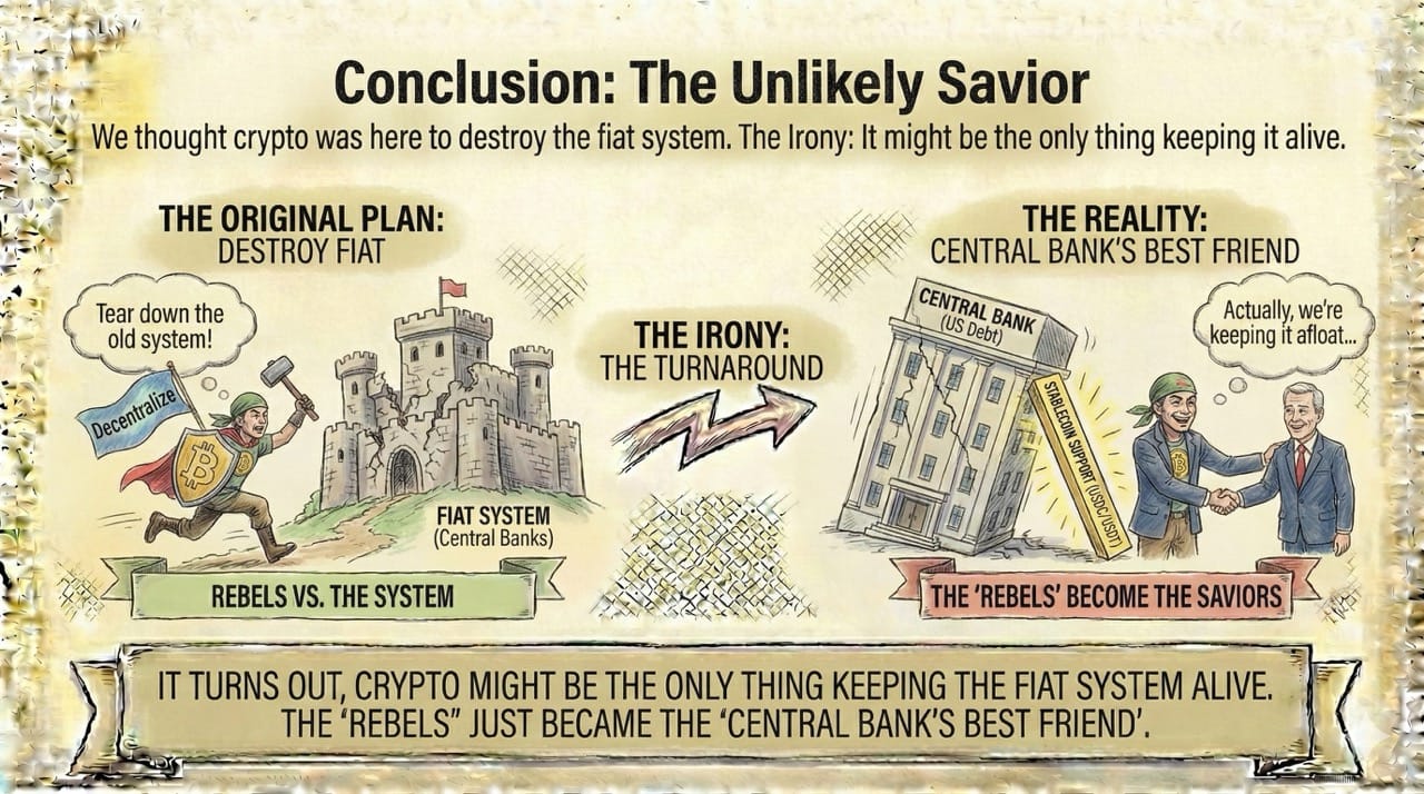 The Irony: It turns out, crypto might be the only thing keeping the fiat system alive. The "Rebels" just became the "Central Bank's Best Friend."