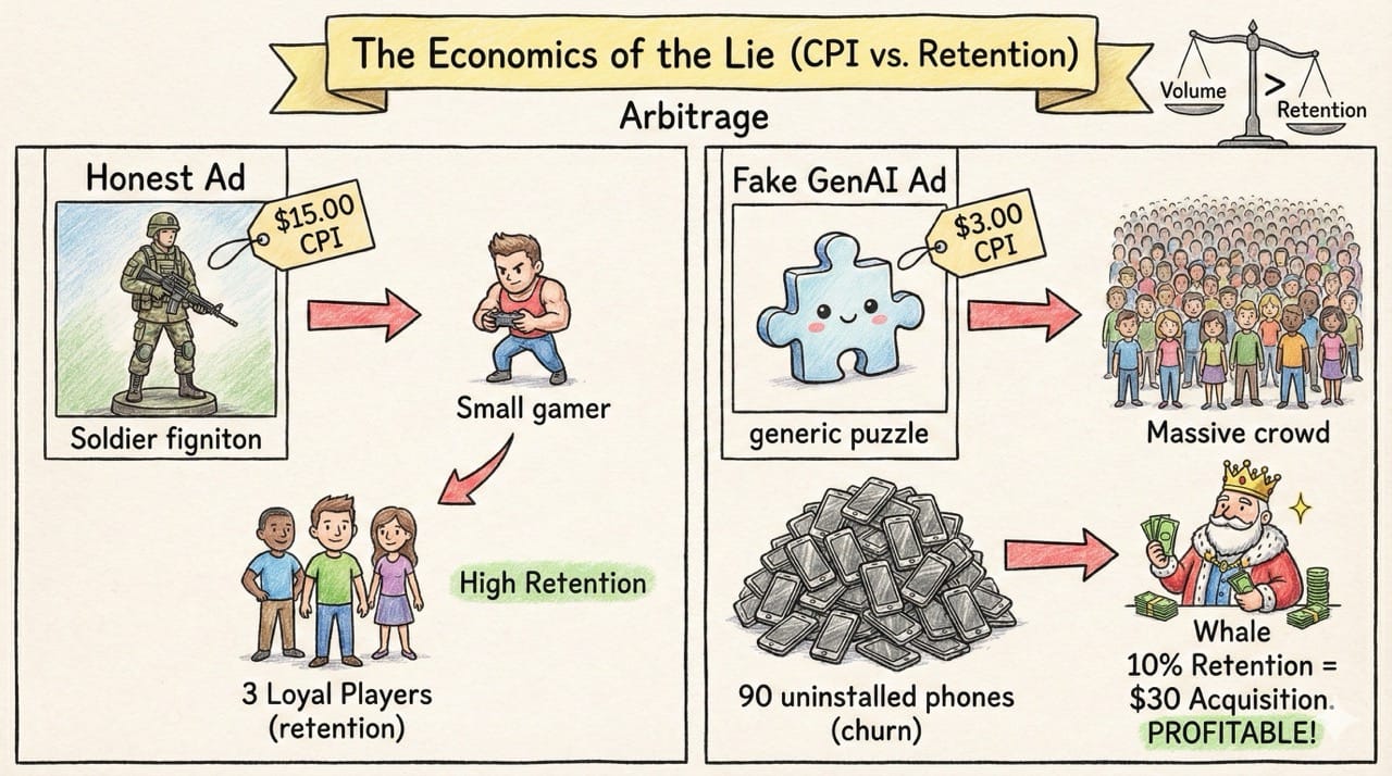 Even if 90% of the users uninstall the game immediately (atrocious retention), the 10% who stay were acquired for $30. If the "Honest" acquisition cost was $50, the Lie is Profitable.
