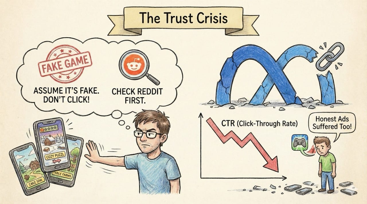 This is a Tragedy of the Commons. Users are developing "Ad Blindness" and "Ad Distrust." When I see a cool looking game on Instagram now, I assume it is fake. I don't click. I check Reddit first.