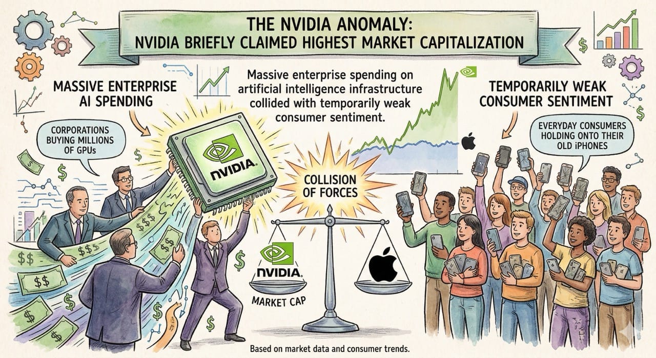 This happened because massive enterprise spending on artificial intelligence infrastructure collided with temporarily weak consumer sentiment.