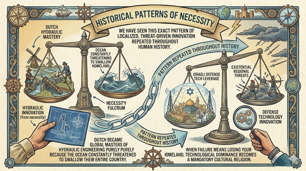 We have seen this exact pattern of localized, threat-driven innovation repeated throughout human history.