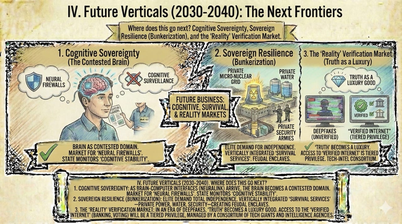 1. Cognitive Sovereignty: As Brain-Computer Interfaces (Neuralink) arrive, the brain becomes a contested domain. We will see a market for "Neural Firewalls" to protect high-value individuals from cognitive surveillance. Conversely, the state will contract firms to monitor the "cognitive stability" of nuclear operators.