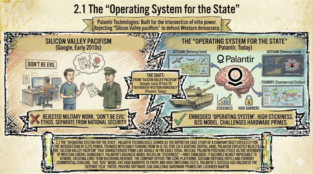 SpaceX and Palantir proved this model. They aren't just vendors; they are strategic partners. The US cannot fight a modern war without Palantir’s software or Starlink’s satellites. The state has "hollowed out"—it retains the authority to govern, but rents the capacity to do so from the private sector.