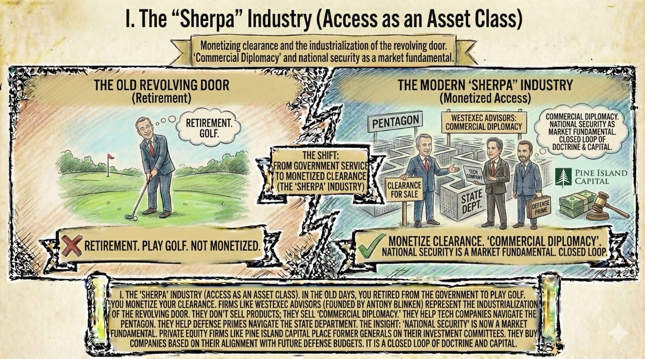 Firms like WestExec Advisors (founded by Antony Blinken) represent the industrialization of the revolving door. They don't sell products; they sell "Commercial Diplomacy."