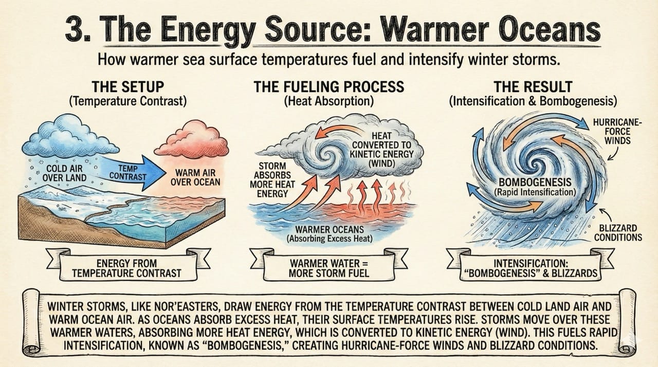 Intensification: This heat is converted into kinetic energy (wind) through the release of latent heat. A warmer Atlantic Ocean provides the fuel for Nor'easters to rapidly intensify (a process known as "bombogenesis"), creating hurricane-force winds and blizzard conditions.