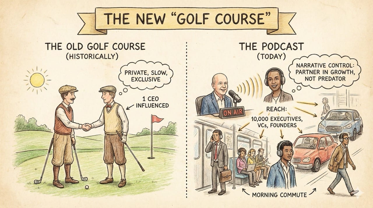 Historically, deals were greased on the golf course. It was private, slow, and exclusive. The Podcast is the new golf course.