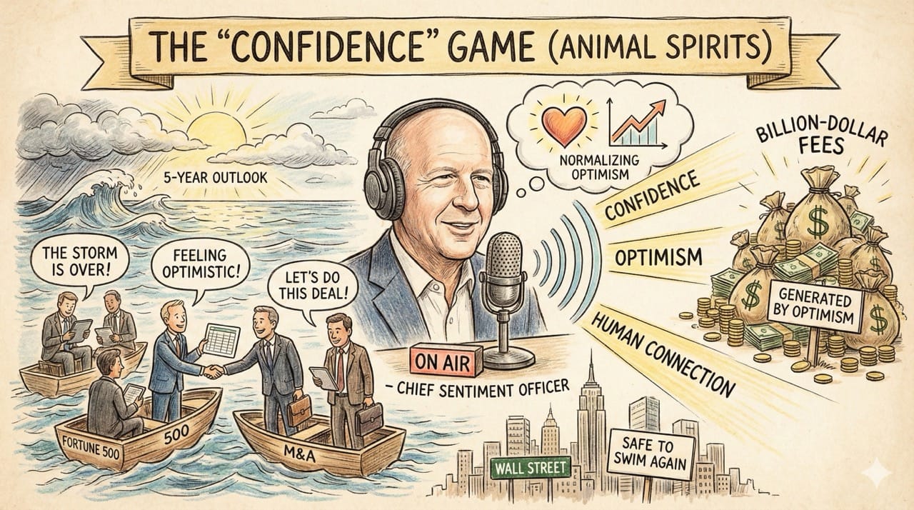 He is acting as the Chief Sentiment Officer. By normalizing optimism, he creates the environment where billion-dollar fees are generated.