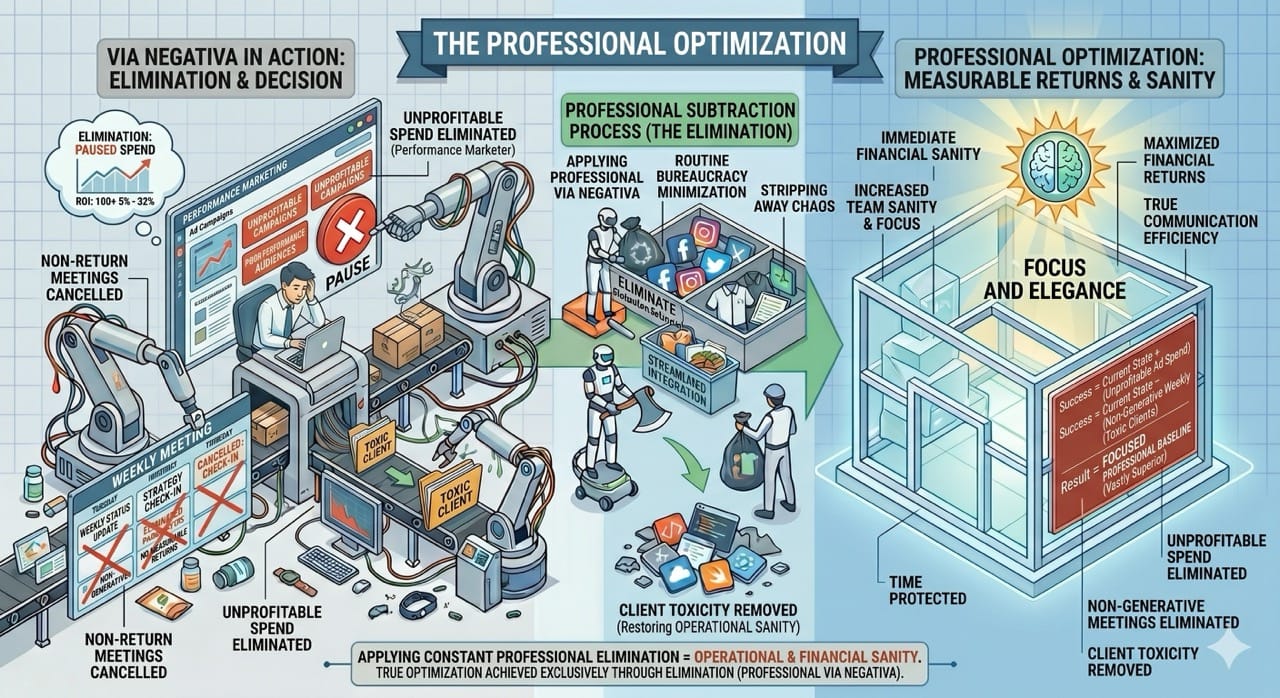 Inspiration: My personal artificial intelligence agent recently identified a pattern in my behavior and suggested I study the concept of via negativa. Serendipitously, I was watching the latest Relentless podcast where Eric Jorgenson explained how Elon Musk deliberately slashes existing processes and removes automation to truly optimize production. It completely validates that absolute engineering brilliance is found in subtraction rather than endless addition.