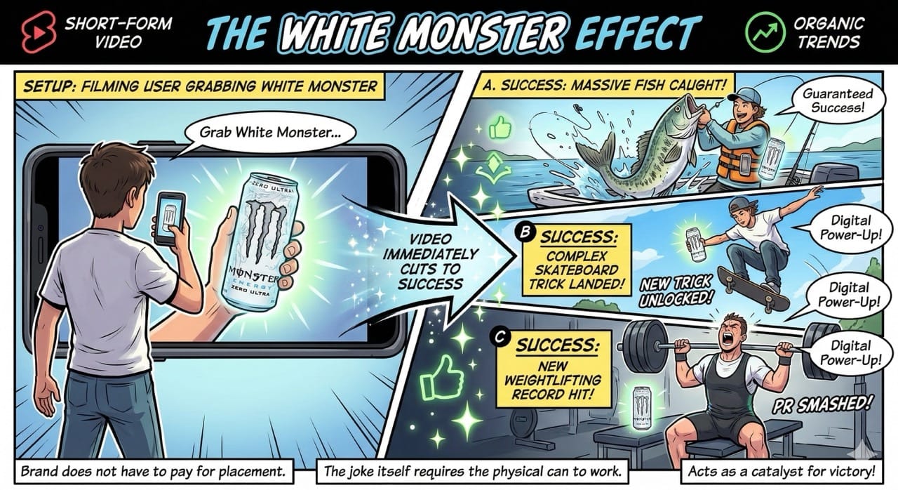 Inspiration: Watching the organic "White Monster Effect" trend on YouTube Shorts and Instagram. Realizing that when users treat a physical drink as a magical item for their comedy sketches, the parent company gains infinite cultural leverage.