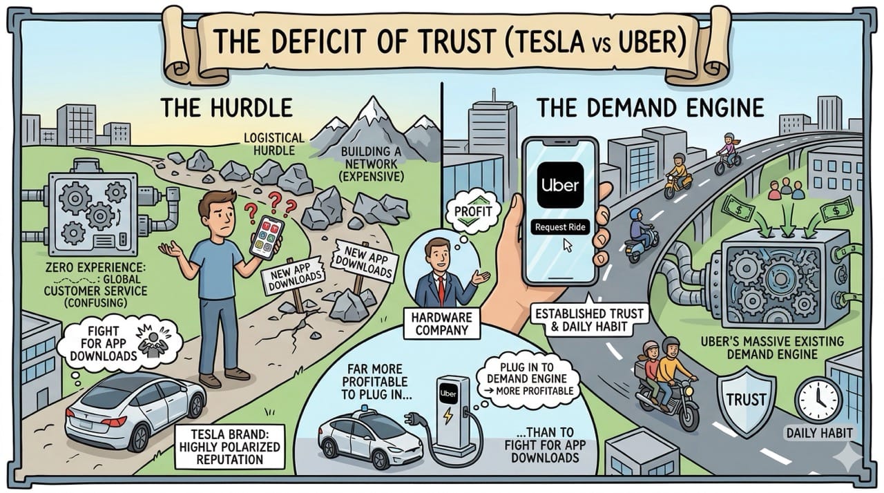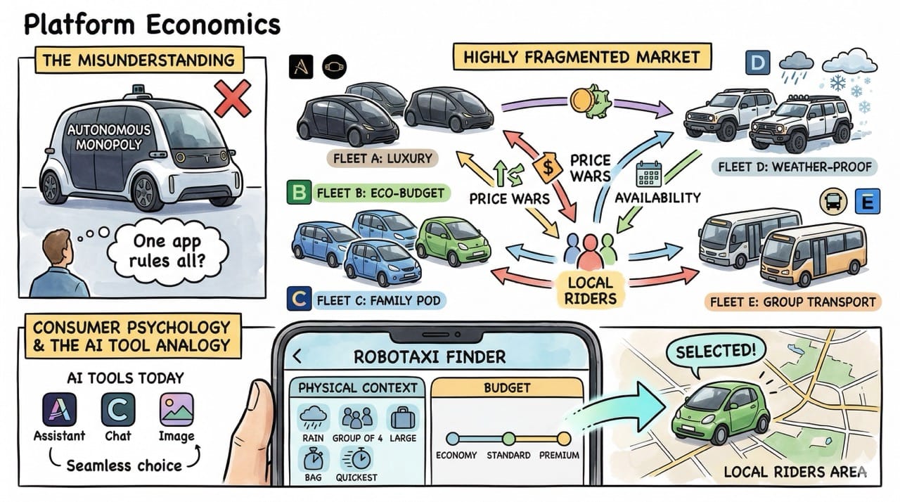 Inspiration: Analyzing the current autonomous vehicle landscape with Tesla FSD and Waymo. Realizing that the ultimate economic winner of the robotaxi wars is not the hardware manufacturer, but the marketplace that connects the machines to the consumer.