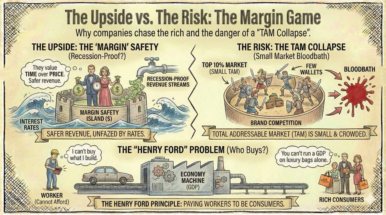 Selling to the rich is safer. They don't stop spending when interest rates rise. They value time over price. This creates "Recession-Proof" revenue streams for companies (or so they think).