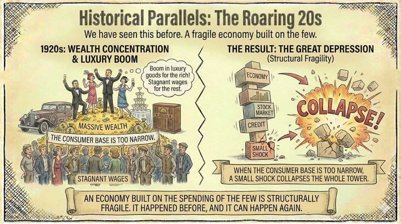 The result? The Great Depression. When the consumer base is too narrow, a small shock collapses the whole tower. An economy built on the spending of the few is structurally fragile.