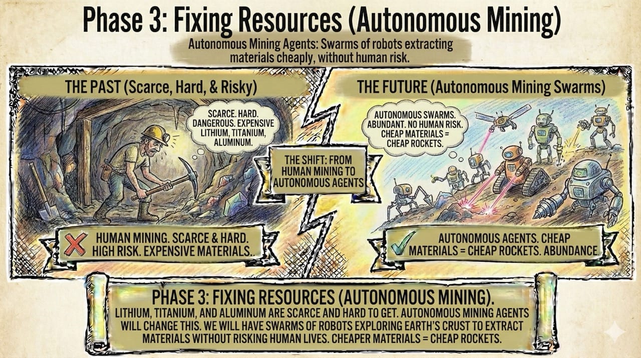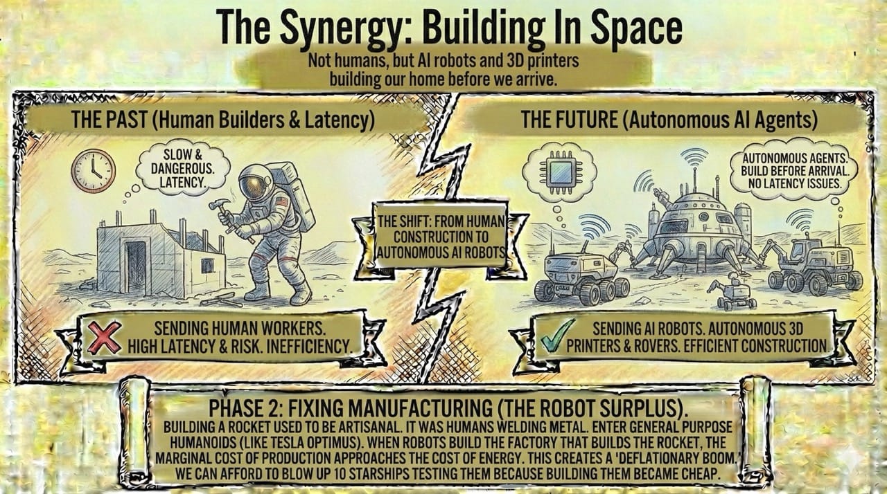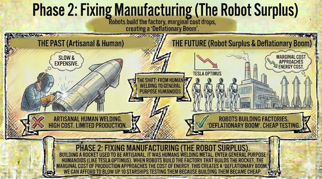 When robots build the factory that builds the rocket, the marginal cost of production approaches the cost of energy. This creates a "Deflationary Boom." We can afford to blow up 10 Starships testing them because building them became cheap.