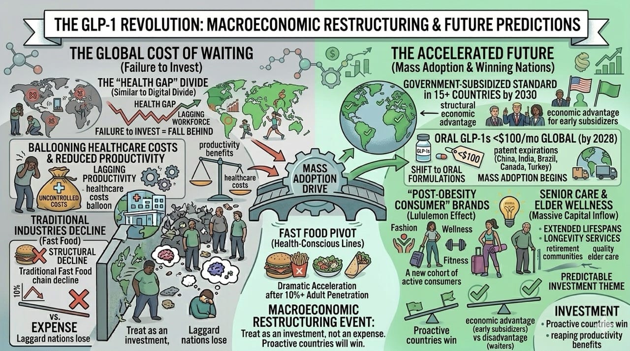 Just as nations that failed to invest in internet infrastructure fell behind economically, nations that fail to invest in GLP-1 access will watch their healthcare costs balloon while more proactive countries reap the productivity benefits of a healthier workforce.