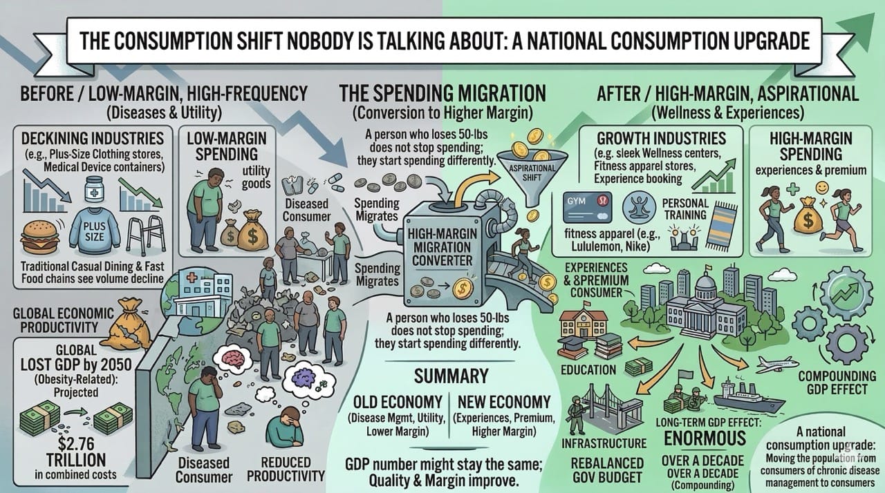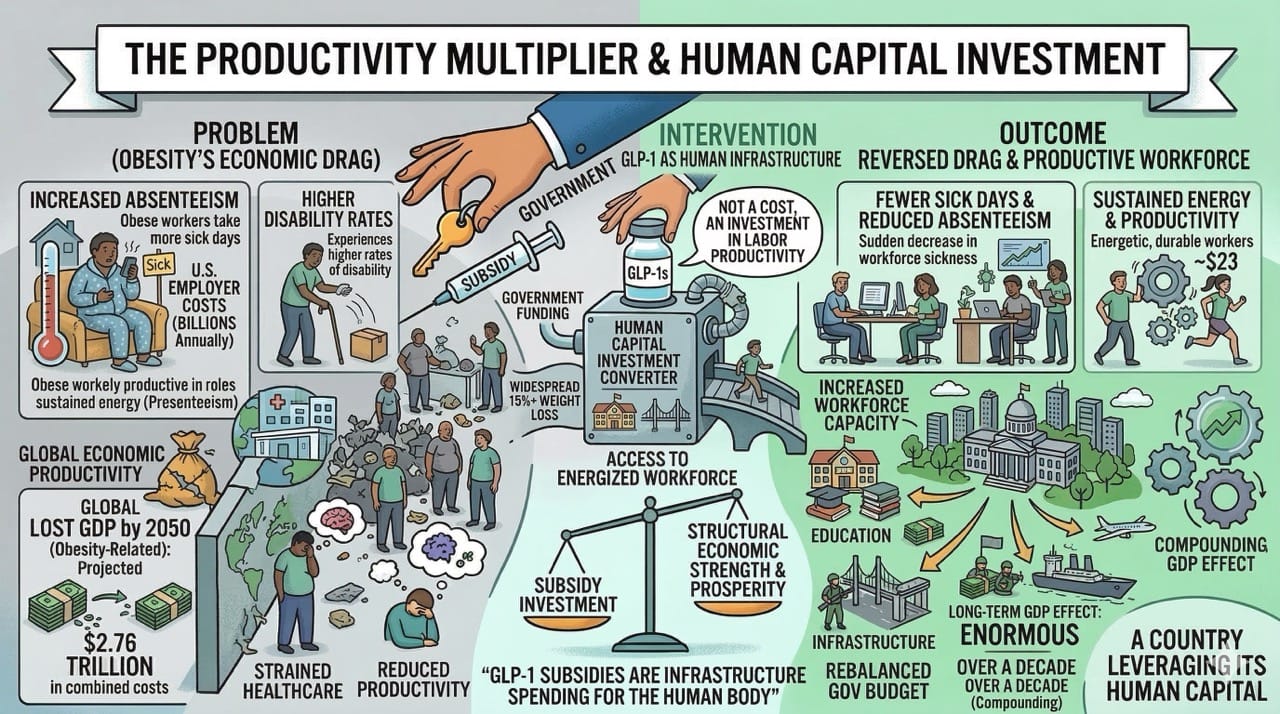 Countries with high obesity rates are sitting on a trillion-dollar arbitrage opportunity. Subsidizing GLP-1 medications is not a healthcare expense. It is a macroeconomic investment that will lower morbidity, boost productivity, and fundamentally restructure consumer spending patterns for decades.
