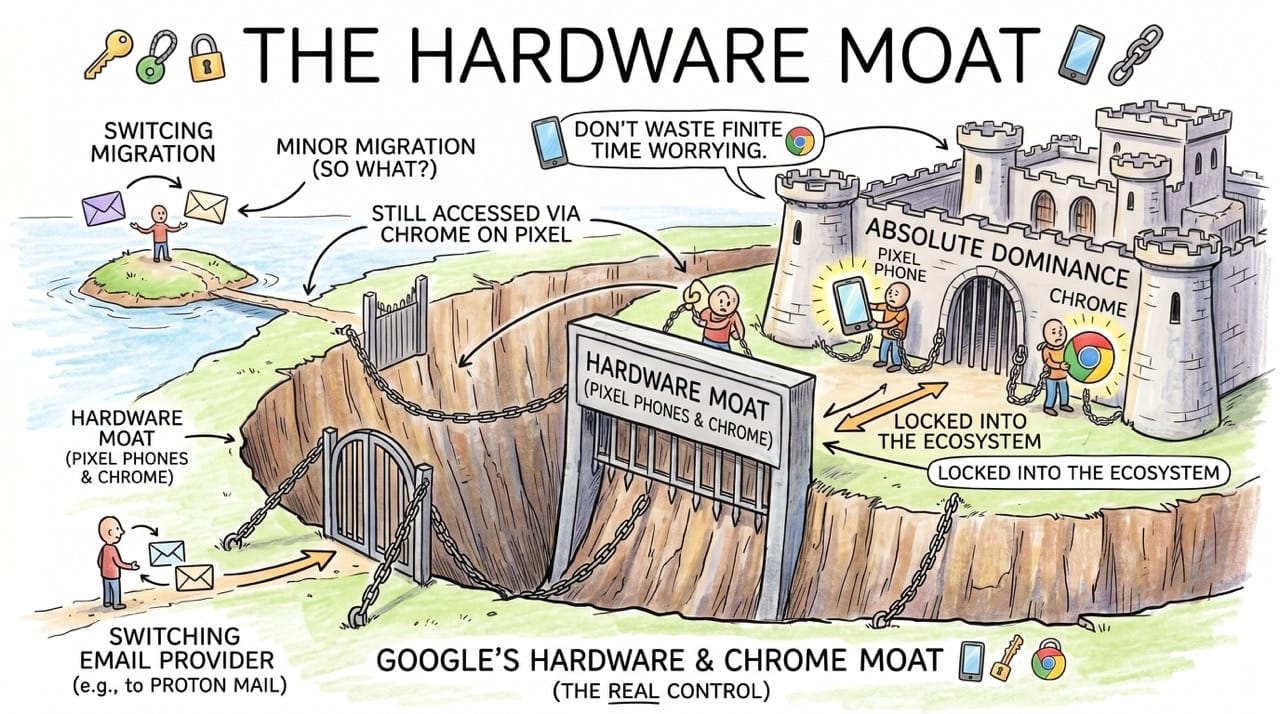 Inspiration: Analyzing the rapid rise of privacy focused software alternatives and the strategic positioning of global technology monopolies. Realizing that switching email providers is incredibly easy, but escaping a hardware ecosystem requires massive psychological effort.